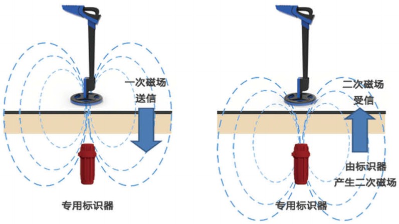 ·当使用电子标识探测仪对地下电子标识器进行探测时,探测仪先向地下发出一定频率的电磁波信号,当靠近标识器时,电子标识器会反射定位仪发出的信息,从而被探测仪发现和接收,并通过声音和读数来告知操作者地下设施的全面信息。