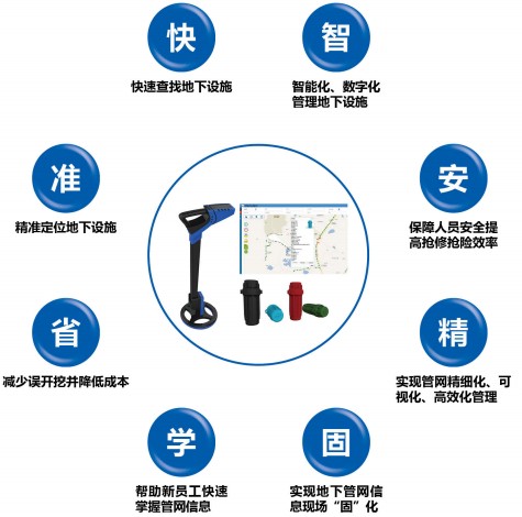 ·管线*定位系统由电子标识器和电子标识探测仪、电子标识后台管理系统三部分组成。管线*定位系统可对密集的城市地下管线和重要设施进行标识,从而准确、安全、快速地对它们进行定位,不但大大提高了管理水平和工作效率,同时也避免了使用和维护工作中潜在的危险,避免了“挖爆管”、“误开挖”危及市民生命财产安全的恶性事件和“马路拉链”等不良现象的重复发生,从而实行地下管线精细化管理,智慧化管控。